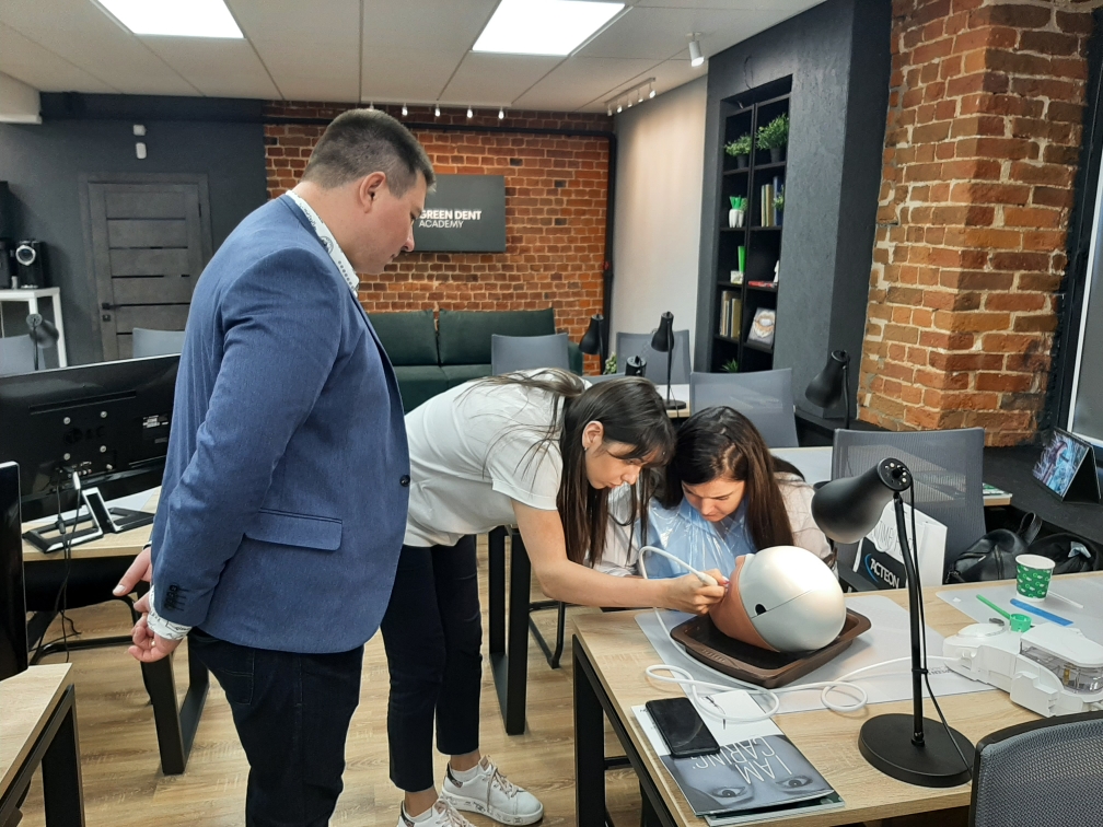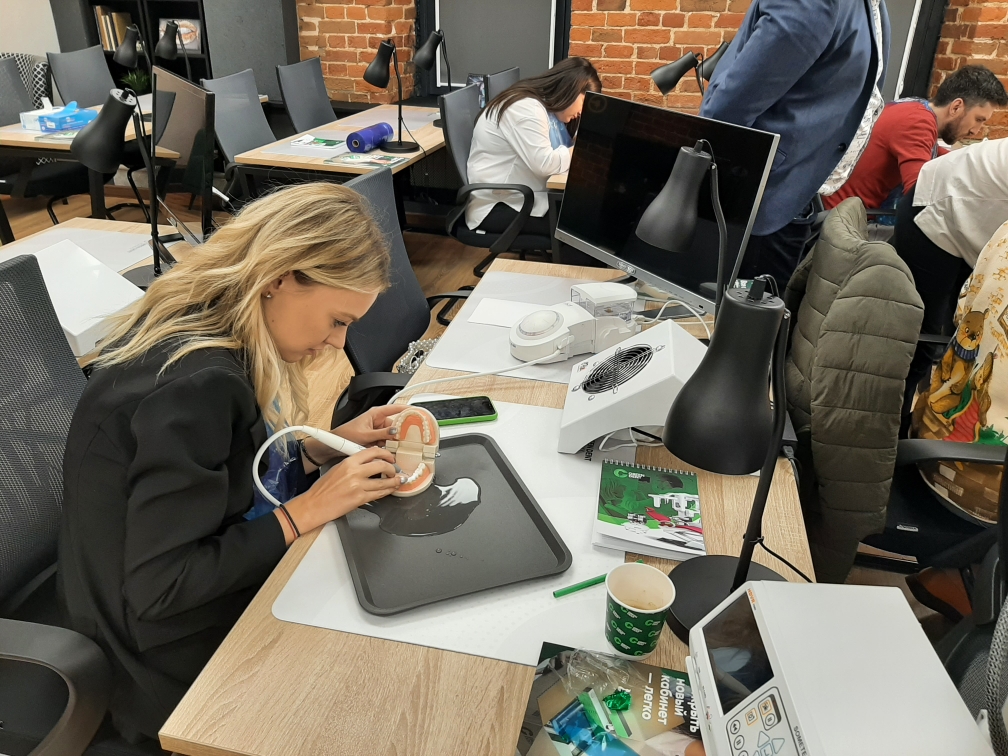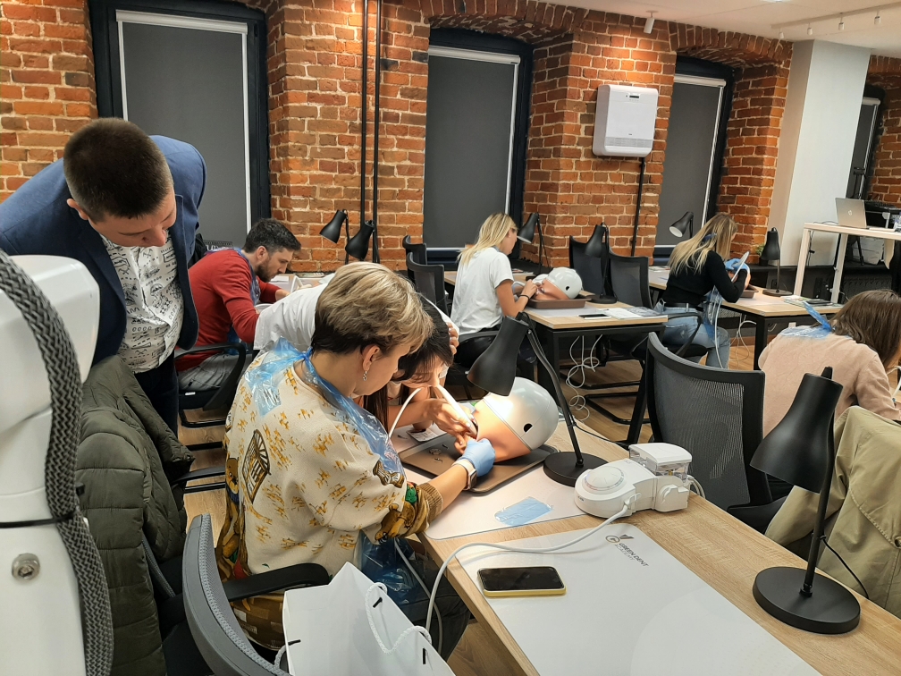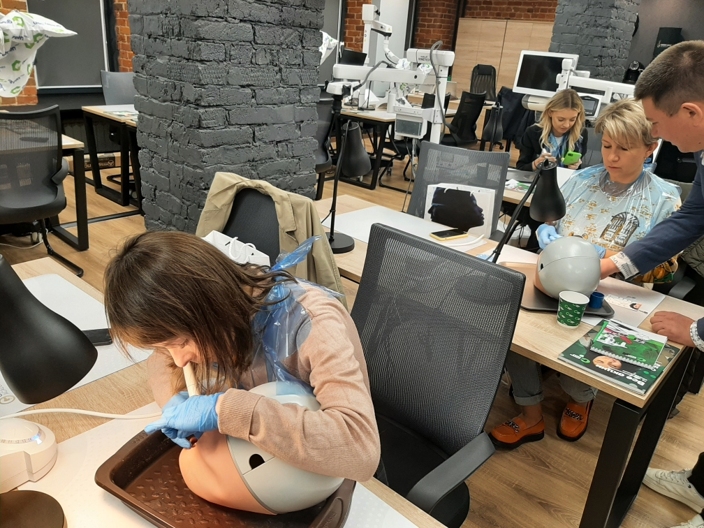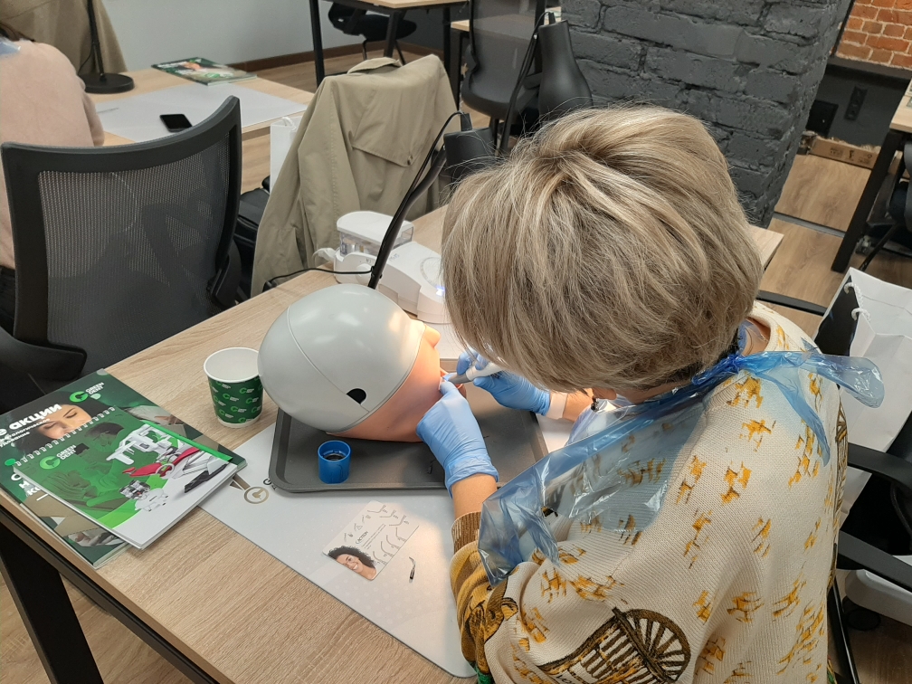 А на практической части специалисты-стоматологи отработали мануальные навыки на фантомах при помощи ультразвукового аппарата.